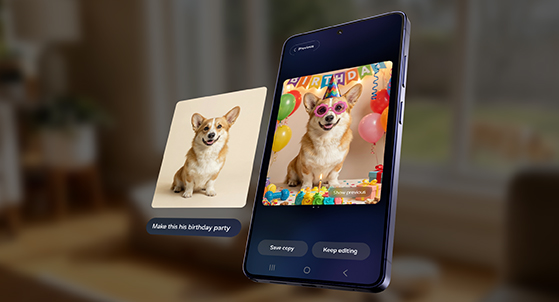Редагуйте фото швидко й легко, використовуючи лише кілька слів та ШІ. Додавайте на фото свого улюбленця аксесуари та інші елементи, просто описавши бажані зміни, і Galaxy AI реалізує ваш задум за лічені хвилини.