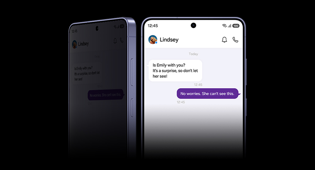Відкрийте для себе екран, який дбає про вашу приватність - ексклюзив Galaxy S26 Ultra. Просто увімкніть цю функцію і Privacy Display використовуватиме інноваційні технології для захисту вашої конфіденційної інформації шляхом приховування всього екрана від сторонніх очей. Або ж ви можете вибрати, що хочете приховати, наприклад, певні програми, усі вхідні повідомлення чи PIN-коди та паролі, коли вводите їх в налаштуваннях, на екрані блокування чи в захищеній папці.