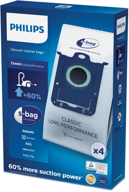 Оригінальний мішок Philips S-bag можна використовувати для всіх мішкових пилососів Philips та Electrolux Group (Electrolux, AEG, Volta, Tornado). Забудьте про метушливий і безкінечний пошук мішка для пилу, достатньо знайти логотип S-bag.