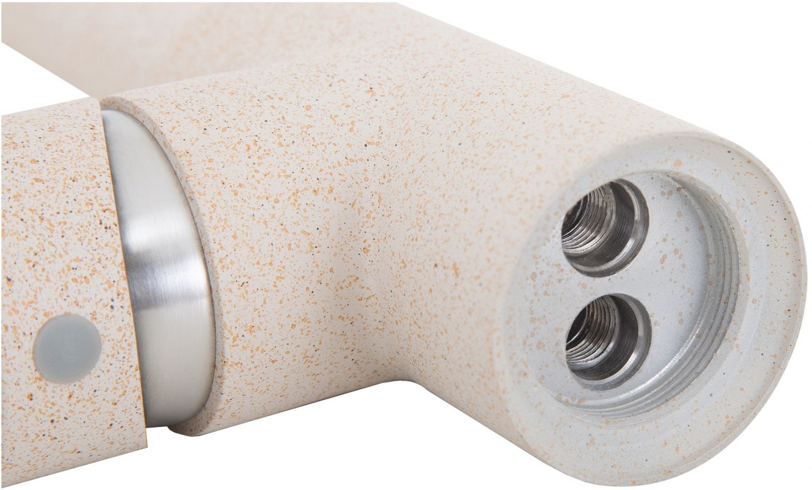 Представлений тут змішувач — урізний кухонний змішувач, виготовлений із високоякісної неіржавкої сталі з покриттям кольору Terra, і має поворотний вилив з винесенням 22 см. Модель установлюється на один отвір і обладнується шланговим під'єднанням під діаметр 3/8".