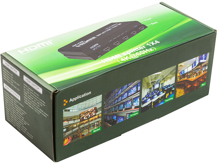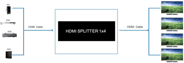 Сплітер HDMI 1x4 використовує одне джерело HDMI, забезпечуючи доступ до кількох приймачів HDMI. Це дає змогу легко розділити один пристрій HDMI на 4 монітори або проєктори, сумісні з HDMI. Крім того, його можна розмістити на кінці довгого кабелю HDMI для регенерації сигналу HDMI. Роздільна здатність цього розгалужувача HDMI може становити до 3840x2160/60 Гц.