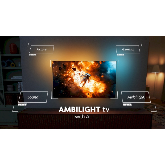Пориньте в найкращий контент із універсальним телевізором OLED+. Легендарний звук від Bowers & Wilkins, яскрава і реалістична картинка, а також занурення в контент із 4-стороннім підсвічуванням Ambilight приємно здивують вас.