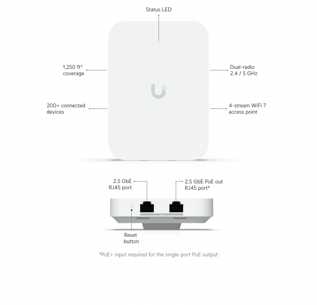 Завдяки підтримці Wi-Fi 7 з 4 просторовими потоками U7-IW забезпечує високу швидкість передачі даних і стабільне з’єднання навіть при великій кількості підключених пристроїв. Вона гарантує знижену затримку та високу пропускну здатність, що ідеально підходить для сучасних потреб, таких як стрімінг у високій якості чи інтенсивний обмін даними. Точка доступу оснащена портами 2.5 GbE, включаючи один PoE-вхід і один PoE-вихід, що дозволяє живити додаткові пристрої, такі як інша точка доступу, через один кабель. Це спрощує розгортання мережі в обмеженому просторі, зменшуючи потребу в додаткових джерелах живлення.