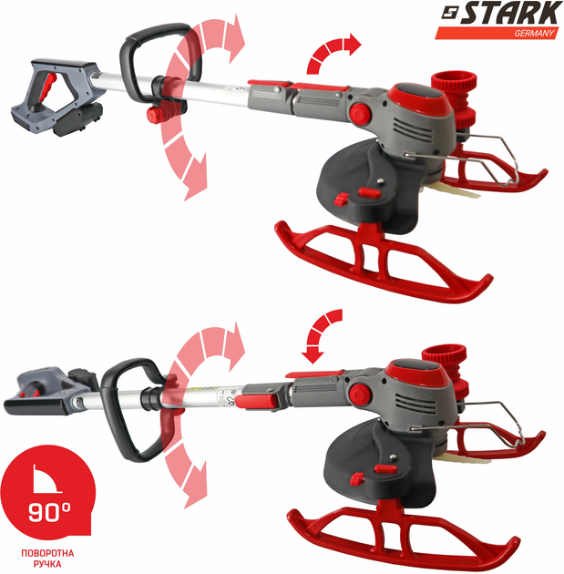 Особливості акумуляторного тримера Штарк GT-21- Модель виконує скошування за допомогою пластикового ножа (2 види: з прямим та вигнутим лезом, металевого ножа та косильного металевого диска)