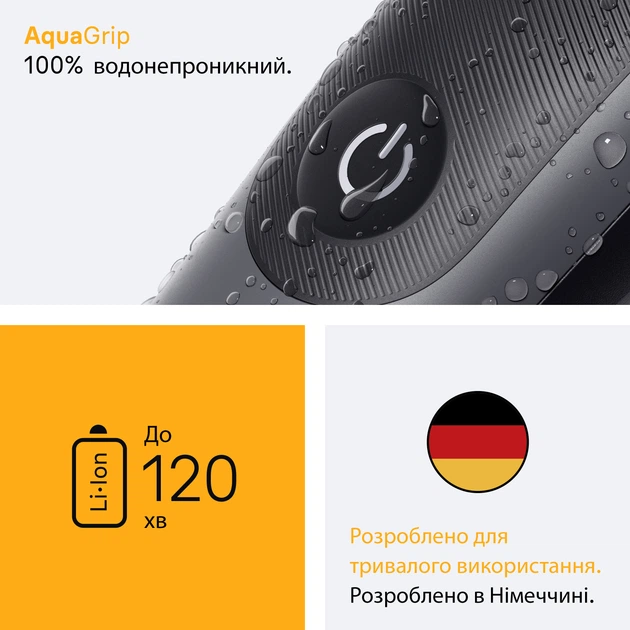 Корпус тримера на 100% водонепроникний, а завдяки покриттю AquaGrip він не вислизає з руки навіть у душі. Це дозволяє використовувати пристрій як у сухому, так і у вологому режимі – повна свобода дій у будь-яких умовах.