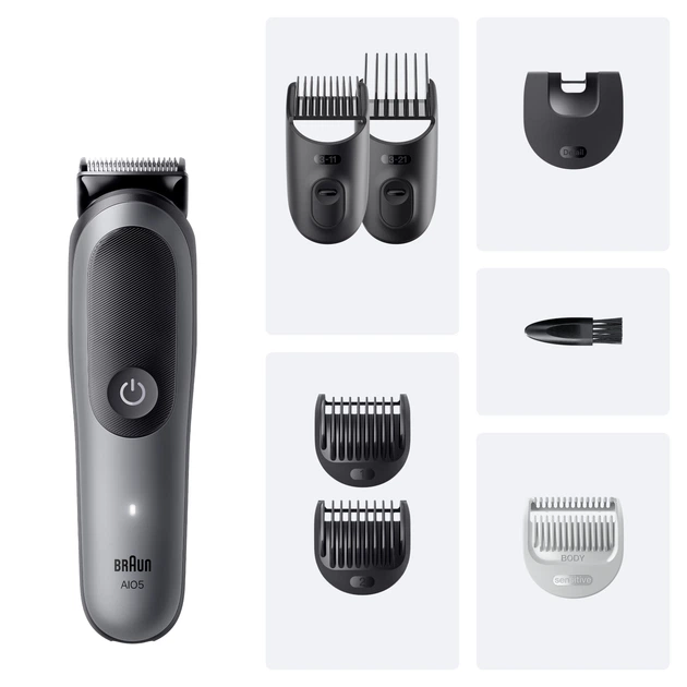 Braun Series 5 AIO 5520 – це універсальний набір для грумінгу «7 в 1», розроблений для точного, безпечного та зручного догляду за волоссям по всьому тілу – від голови до ніг. У цьому багатофункціональному тримері поєднані передові технології, практичність та німецька надійність.