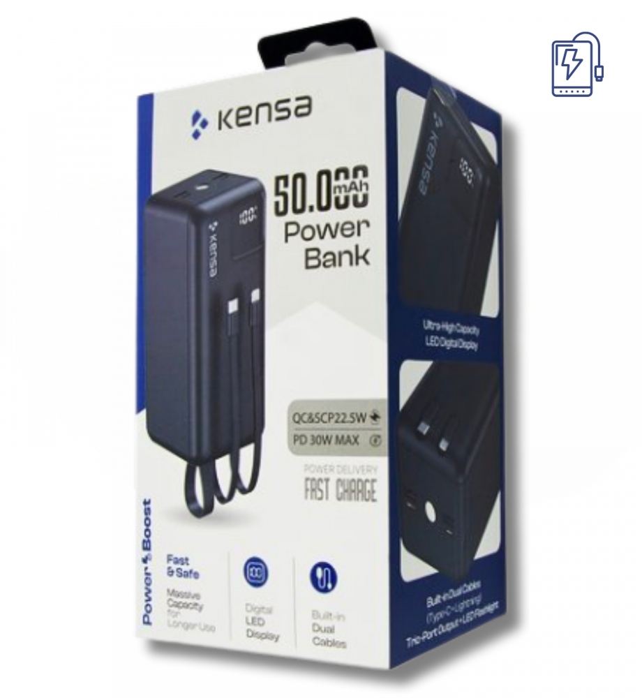 - Опис Повербанк KENSA 50000 — це професійний зовнішній акумулятор підвищеної ємності, створений для забезпечення високої автономності в будь-яких умовах. Модель відрізняється наявністю вбудованих кабелів Type-C та Lightning, що робить її універсальним інструментом для зарядки різних типів мобільних пристроїв без необхідності використання додаткових аксесуарів.