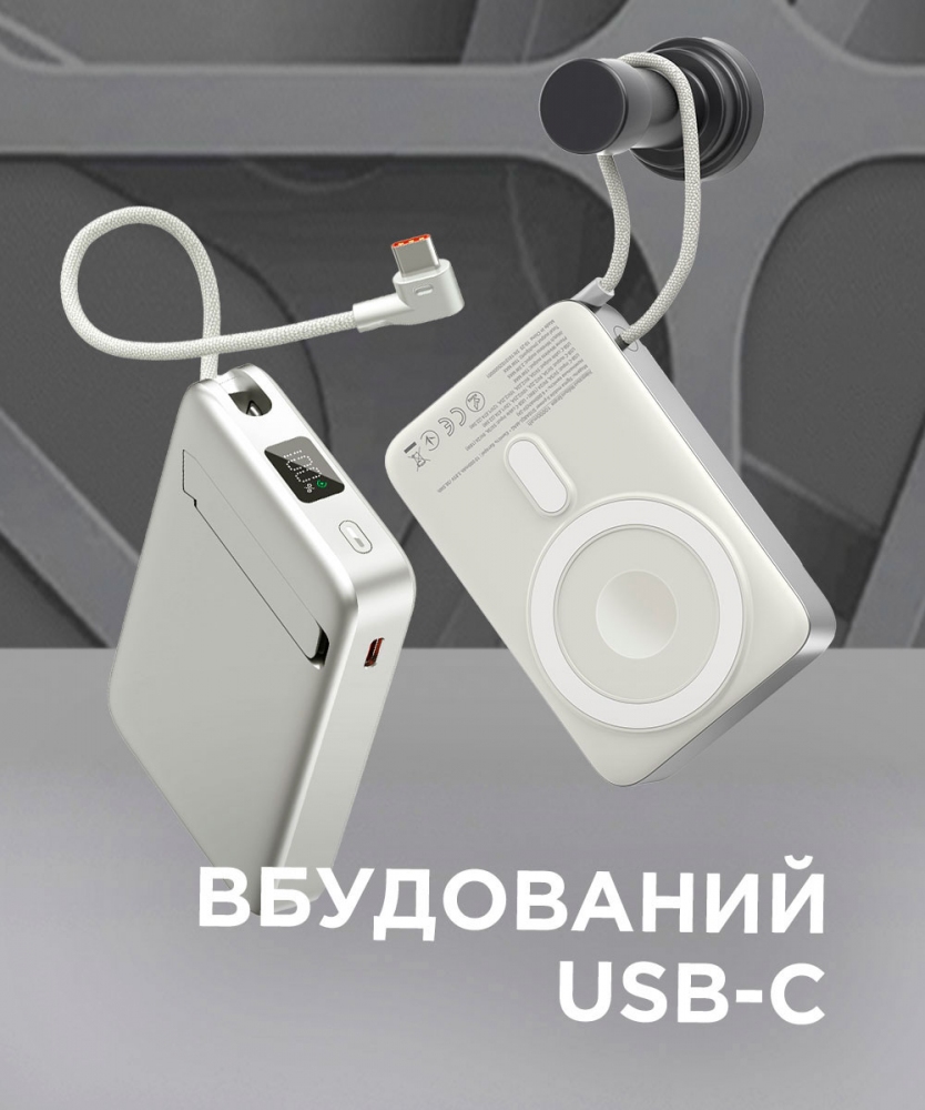 Однією з головних переваг є інтегрований кабель USB-C. Це ідеальне рішення, яке усуває найпоширенішу проблему: відсутність кабелю в потрібний момент. Він завжди під рукою, підтримує зручну зарядку і дозволяє під'єднати навіть ґаджети, які не підтримують бездротову технологію.
