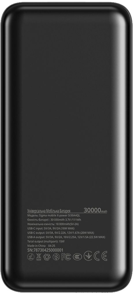 SI30A4QL— базова модель із оновленого модельного ряду павербанків від відомого українського бренду Sigma mobile. Павербанк ємністю 30 000 мА*г, із максимальною вихідною потужністю до 22.5 Вт, що забезпечує стабільне живлення смартфонів, планшетів та інших гаджетів.