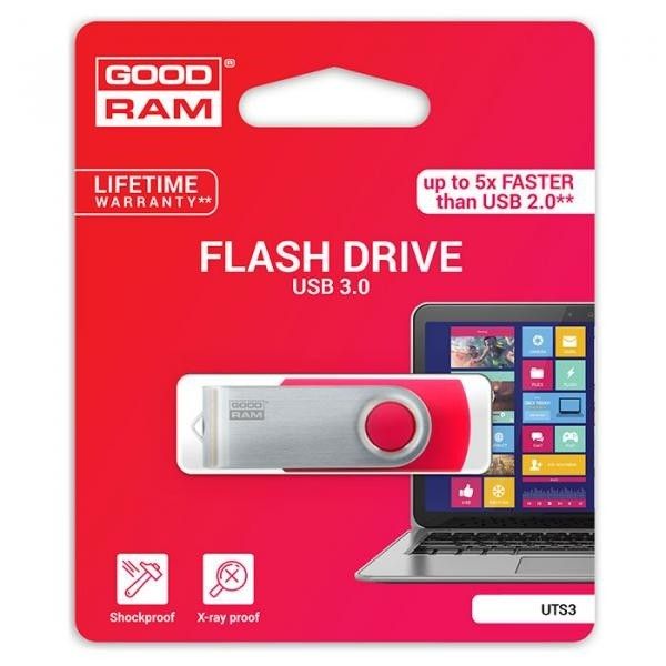 Універсальність і функціональність - це найважливіші властивості GOODRAM UTS3. Міцний корпус з металевою поворотною скобою не тільки чудово захищає дані, що зберігаються, а й дозволяє не турбуватися про ковпачку, який може загубитися. GOODRAM UTS3, на відміну від аналогічних продуктів на ринку, характеризується фірмовими компонентами і довічною гарантією а також швидким інтерфейсом 3.0.