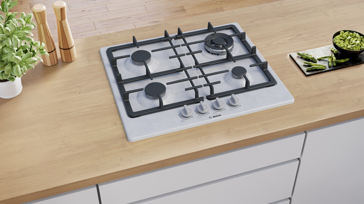 Serie | 4 Газова панель Bosch PGH6B5K90R шириною 60 см з нержавіючої сталі: висока якість і преміальний дизайн для більш тривалої насолоди приготуванням їжі.