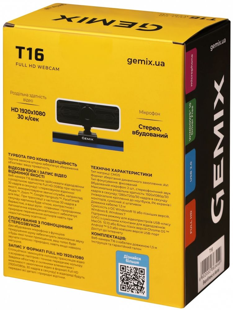 Веб-камера Gemix Т16, з роздільною здатністю FullHD (1920x1080р). Це неперевершене рішення для спілкування та запису відео Twitch, Zoom, YouTube, Skype, FaceTime для Mac. Навчайтеся онлайн, проводьте відео конференції, записуйте відео та робіть фото. Спілкуйтеся з повноцінним стерео звучанням, 2 вбудованих мікрофони з функцією придушення шуму, забезпечують захоплення звуку з відстані до 3 м. Ваш голос буде звучати чисто та чітко, навіть якщо навкруги вас метушня. Технологія поліпшення зображення, автоматично регулює якість зображення в залежності від яскравості освітлення у приміщенні. Універсальне кріплення дозволить легко закріпити камеру на вашому екрані. Камера сумісна зі триподом (в комплектацію не входить). Для встановлення та початку роботи чи спілкування, не потрібно встановлювати драйвери, достатньо підключити роз'єм камери та дочекатися коли ваш комп'ютер розпізнає камеру. Щоб захистити ваше приватне життя на камері встановлена захисна шторка. Закрийте її після завершення спілкування.