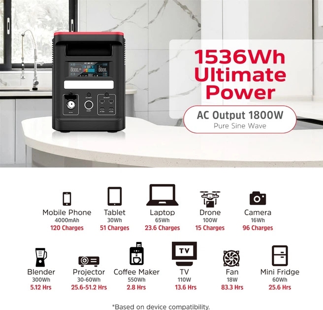 Зарядна станція сумісна з такими енергоємними приладами та пристроями, як електрична плита, мікрохвильова піч, кондиціонер і холодильник. Вона витримує загальну миттєву вихідну потужність до 2700 Вт.