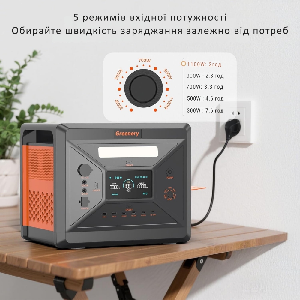 - Опис Портативна зарядна станція SolarPlay (Greenery BCG2500) — це потужне та універсальне рішення для автономного живлення вдома, у подорожах, під час кемпінгу або при аварійних відключеннях електроенергії. Станція оснащена ємною LiFePO4-батареєю на 2304 Вт·год та забезпечує стабільну вихідну потужність до 2500 Вт (пікова — до 4000 Вт), що дозволяє підключати як побутову техніку, так і чутливу електроніку. Greenery BCG2500 підтримує кілька способів заряджання: від мережі 220 В, сонячних панелей через MPPT-контролер (11.5 - 48 В, до 500 Вт), автомобільного прикурювача та генератора. Регульований вхід зарядки дозволяє обирати оптимальну швидкість поповнення заряду залежно від умов використання.