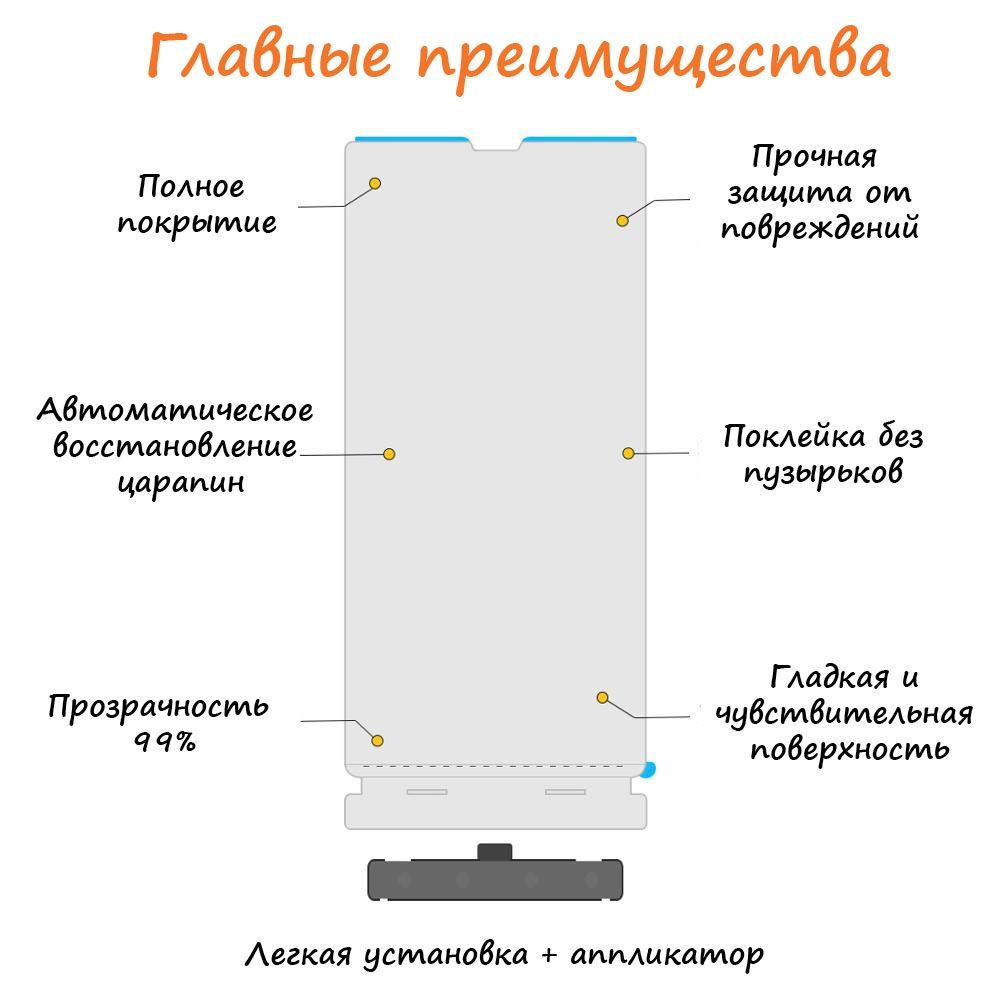Наклеювання плівки не становитиме труднощів, позаяк має фіксувальний аплікатор, завдяки якому наклеїти плівку зможе навіть дитина! Ця серія плівок на 100% покриває ваш екран телефона та захищає від ударів, подряпин. Головна відмітна риса цієї плівки полягає в тому, що вона клеїться на всій поверхні екрана, забезпечуючи максимальне зчеплення з екраном смартфона. Конструкція плівки має заокруглену форму — що дає змогу заходити захисному склу врівень із металевою частиною з боків.Прозорість — близька до 100%, забезпечує кришталево чисте зображення й не має жодного впливу на передане зображення. Плівка має Nano-покриття, що забезпечує ідеальну чутливість сенсорного екрана, що дає змогу вільно розблокувати екран за допомогою екранного сканера відбитку пальців.