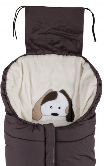 Теплий конверт для колясок коричневого кольору із малюнком собачки. Він не тільки зігріє, а й перетворить коляску на справжній теплий будиночок на колесах. Тому батьки зможуть проводити більше часу з дітьми на свіжому повітрі. Головні особливості конвертів серії Cuccioli Junior у тому, що вони зроблені з водонепроникного матеріалу з вітрозахисними властивостями, обладнані кишенею для зберігання невеликих предметів, капюшон регулюється, а сам конверт повністю відкривається.